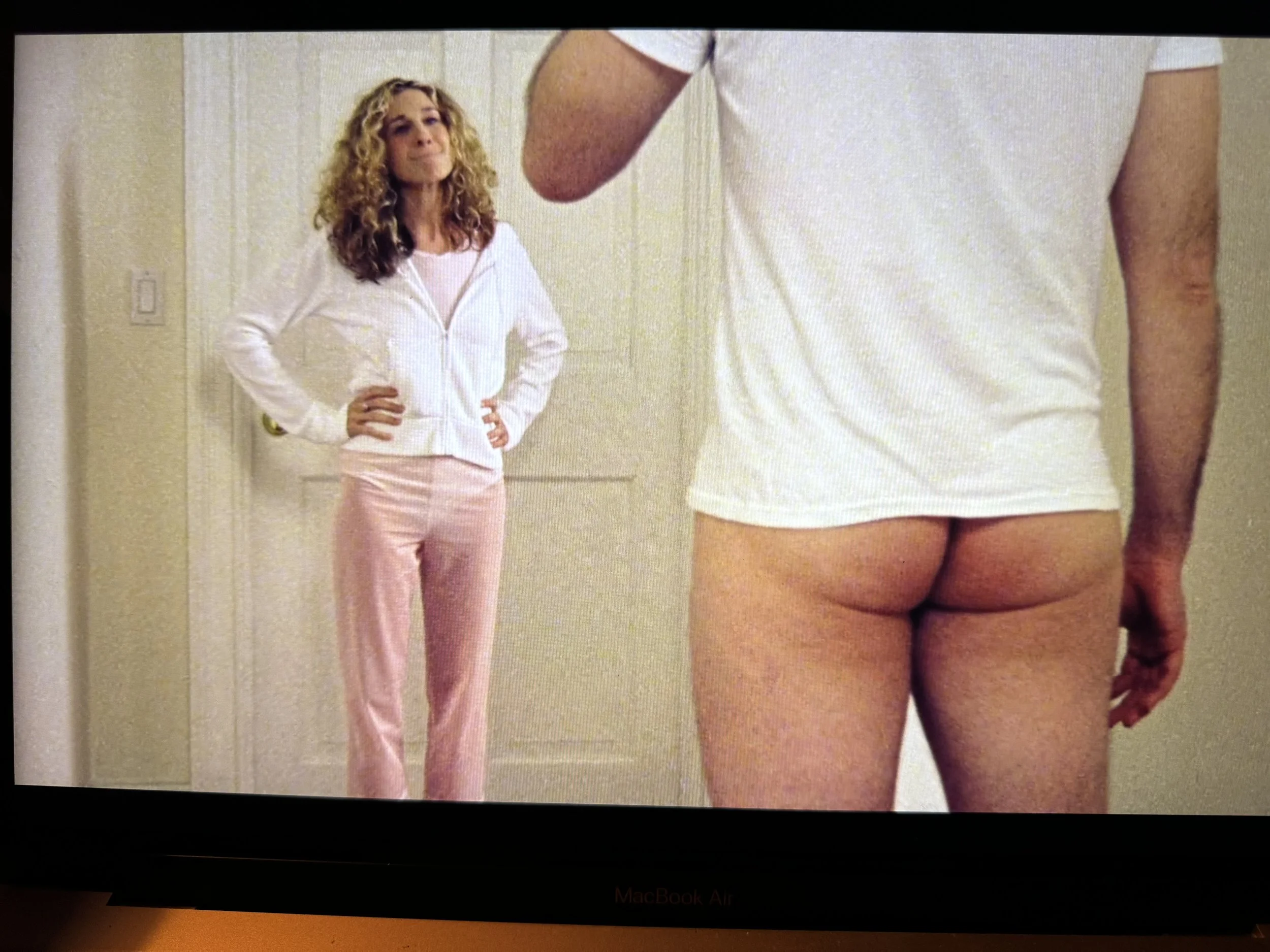 Carrie is staying at at a friend’s house in the Hamptons when the husband greets Carrie in the morning wearing only a t-shirt. No underwear, full frontal. Penis out for her viewing. It’s not erect, it’s not sexual, it’s just there.